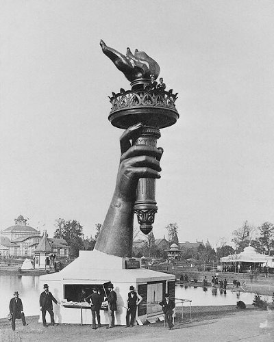 Photo shows the torch and part of the arm of the Statue of Liberty, on display at the 1876 Centennial Exhibition in Philadelphia.