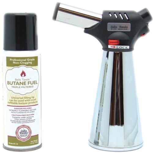 WALL LENK-Bella Tavola: Kitchen Torch with Butane Fuel. This refillable kitchen torch features an adjustable flame control; automatic ignition; a 2400-degree Fahrenheit high output flame; a continuous-use lock; a child-resistant safety lever; and a non-tip wide base. Overall measurements are 5-3/4x4 inches. This package contains one kitchen torch and 1.5 ounces of butane. WARNING- EXTREMELY FLAMMABLE-CONTENTS UNDER PRESSURE-Do not use near fire; open flame; or combustible materials. Imported. Read more...