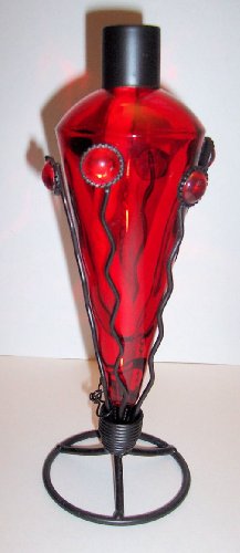 Antique style glass tabletop tiki torch - In Curly Heavy Wire Holder- Accented With red Studs ~~ Removable canister - Twist off cap for easy refill ~~ Clear red holder - Dark bronze finish curly wire holder - Weather-resistant coating ~~ Long-lasting wick - Torch Size: 19-1/2 in. Tall X 3-3/4 in. Diameter ~~ For use with citronnella oil ~ Outdoor use only - Notice: Curly wires may need to be adjusted. Read more...
